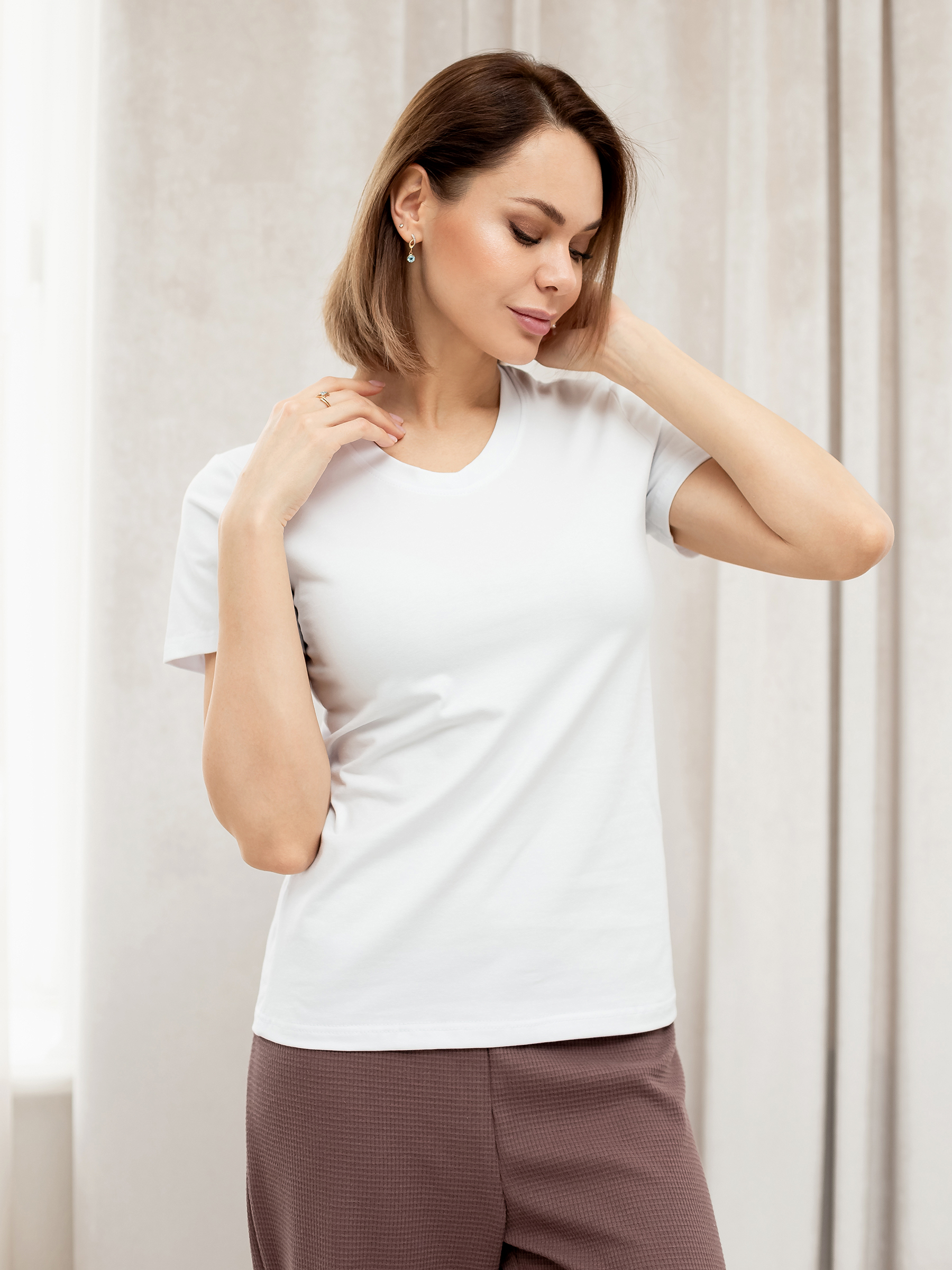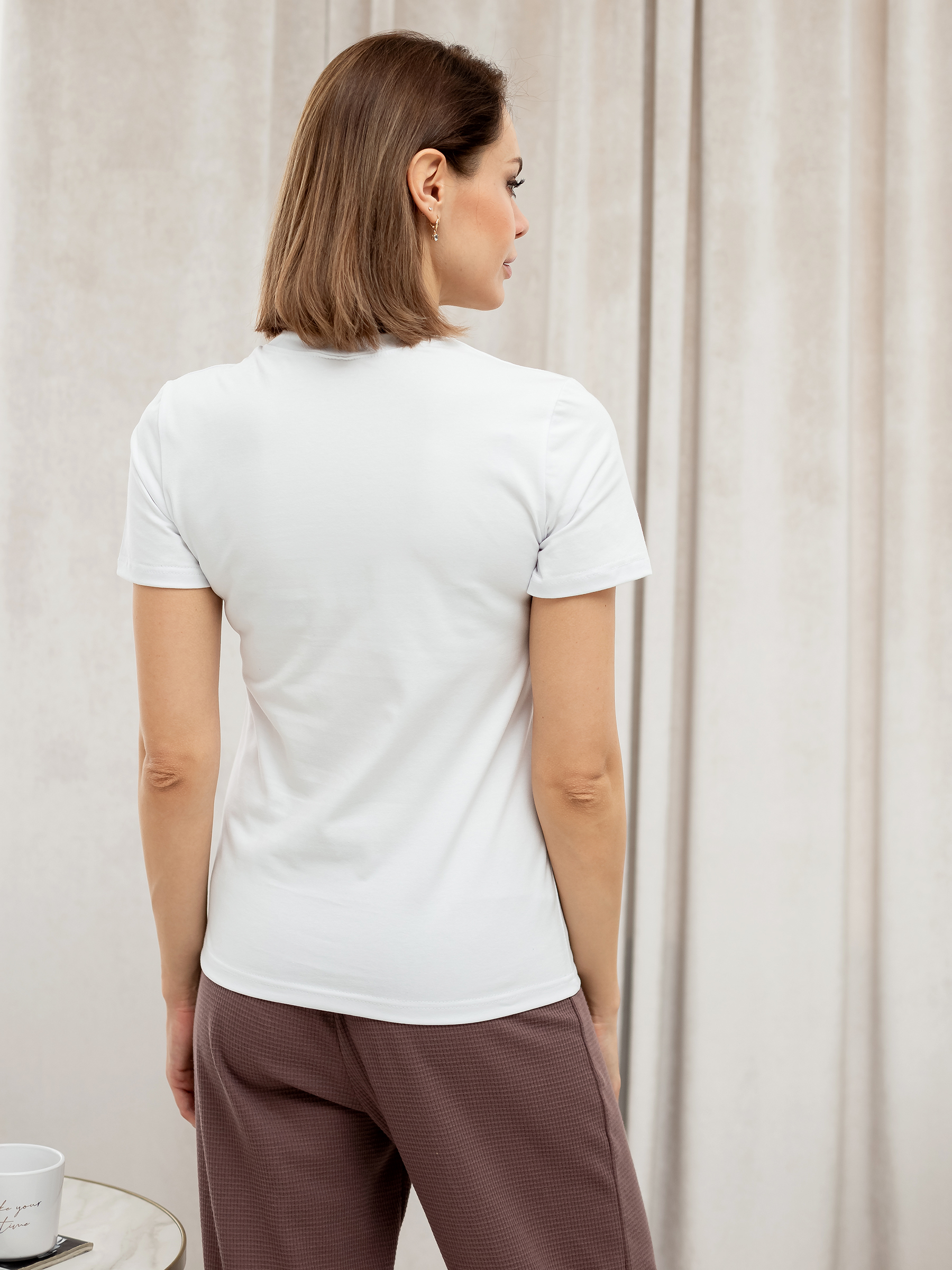 Базовая женская однотонная футболка с коротким рукавом без рисунка.